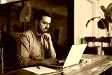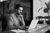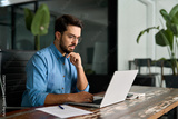 Serious businessman looking at computer thinking on online investment or software development using laptop, busy professional business man company employee, young male programmer working at office.
