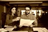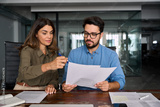 Financial planning, advisory service concept. Female advisor attorney lawyer or bank manager consulting client investor reading document at business meeting reviewing legal paper working in office.