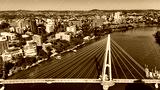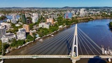 Brisbane CBD, Queensland, Australia: Aerial Image of Modern City Skyline, Skyscrapers, Brisbane River, Urban Infrastructure, Kangaroo Point Bridge, and Waterfront