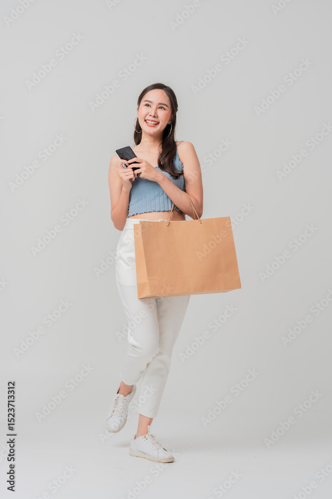 A happy young Asian woman holds colorful shopping bags and a smartphone, radiating joy and satisfaction from her shopping experience. Dressed in a casual outfit, her bright smile reflects excitement,