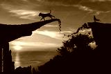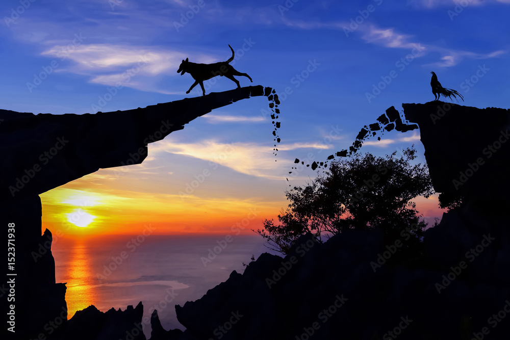 New year 2018 concept. Dog and rooster on the broken stone bridge silhouette background.