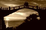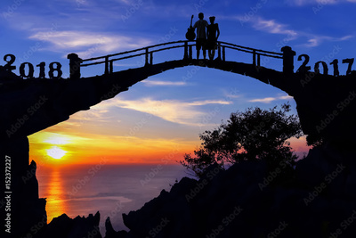 New year 2018 concept. Silhouette couple on the stone bridge background.