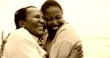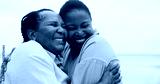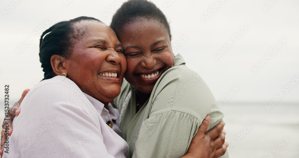Mature mother, daughter and hug on beach for travel, holiday and getaway trip. Women, African family and space with embrace for love, retirement vacation and bonding together for affection in nature