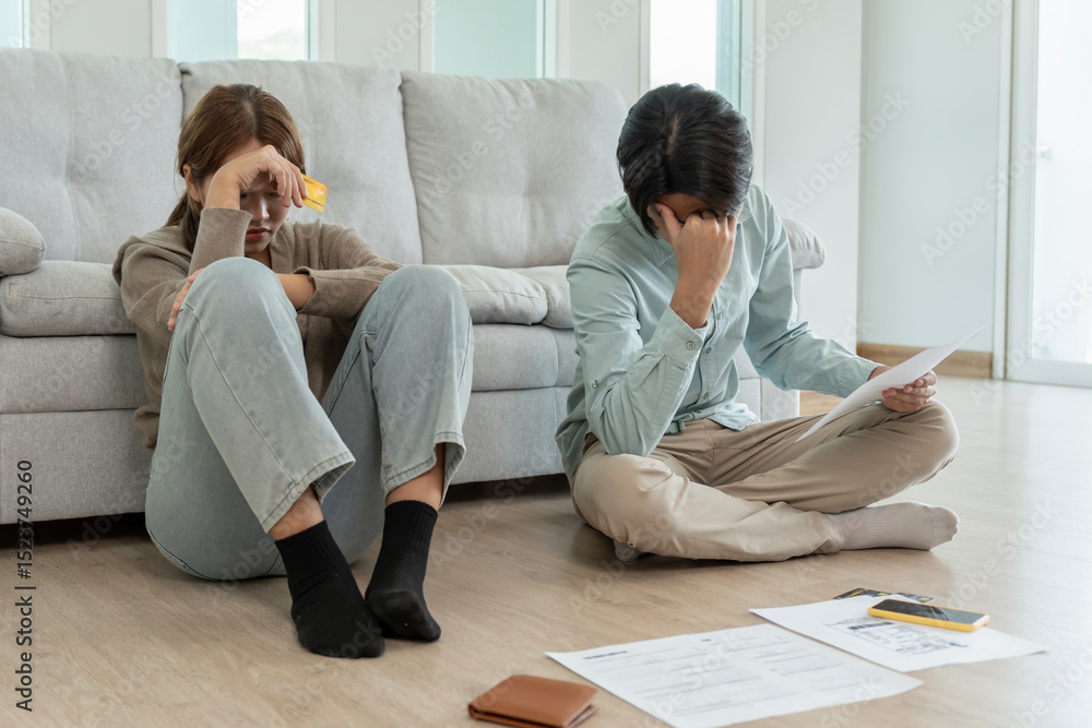 Stressed and headache asian couple with large bills or invoices no money to pay to expenses and business problem. shortage, Financial problems, mortgage, loan, bankruptcy, bankrupt, poor