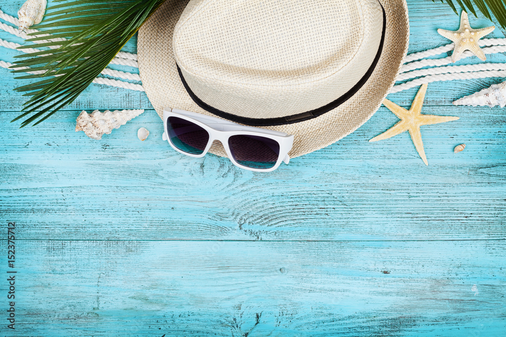 Straw hat, sunglasses, palm leaves, rope, seashell and starfish on blue wooden table top view in flat lay style. Summer holidays, travel and vacation background.