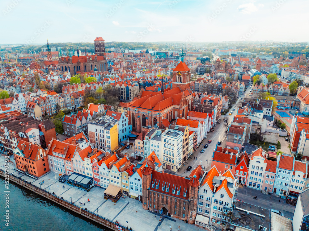 Gdansk with Motlawa river in Poland. Aerial landscape of the Main Town. Old town colourful house with saint Marys church