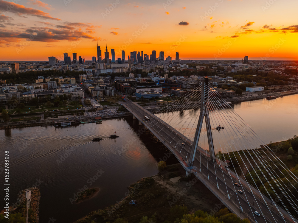 Warsaw city center and skyscrapers in the background Vistula river and Swietokrzyski bridge. Sunset Warsaw aerial view.