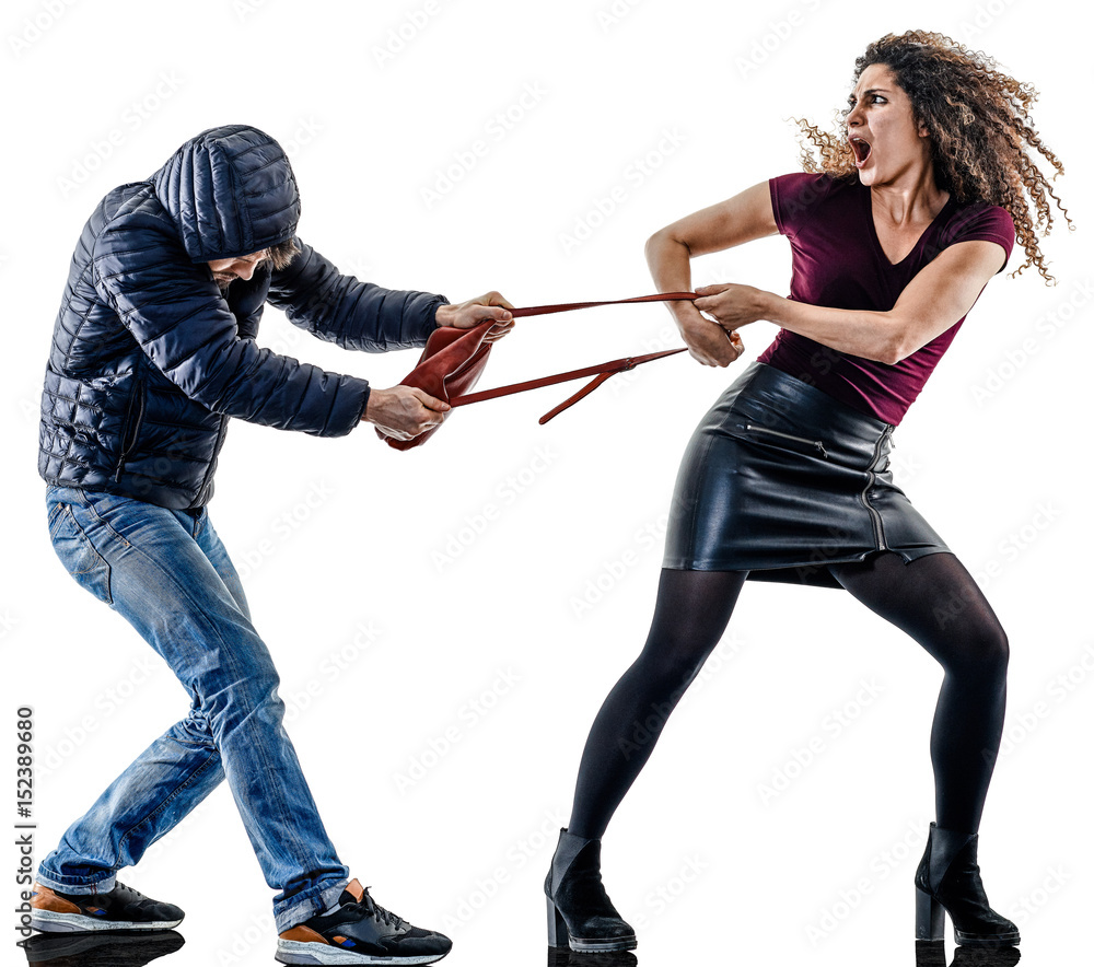 one caucasian woman victim of a thief aggression self defense isolated on white background