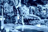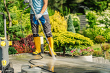 Man Cleans Patio With Pressure Washer on a Sunny Day in a Landscaped Garden