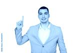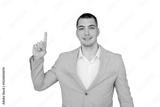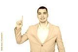Confident businessman gesturing upward with index finger during professional photo shoot, white backdrop