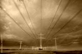 High-voltage power line in high-contrast evening light.