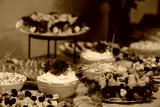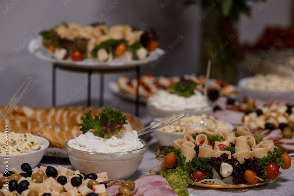 Exquisite Catering Buffet Spread with Cheese, Bread, Vegetables, and Appetizers Elegant Party Food Presentation, Dark Background