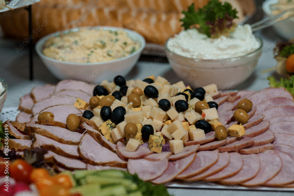 Appetizing Charcuterie Board with Ham, Cheeses, Olives and Spreads. Rustic Table Setting. Food Photography, Culinary Delights