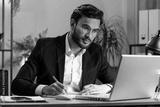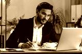 Focused serious Indian businessman freelancer working at modern home office workplace desk writing notes ideas in notebook. Male Hindu in formal suit preparing planning presentation startup project