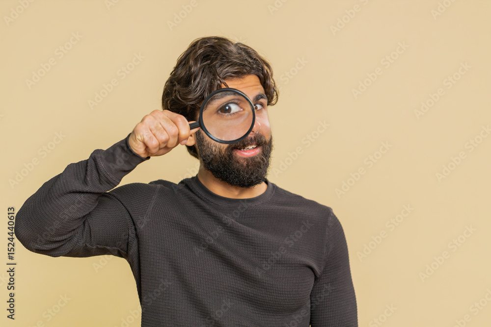 Investigator researcher scientist man holding magnifying glass near face, looking into camera with big zoomed funny eyes, searching, analyzing. Young Hindu guy isolated on beige studio background.