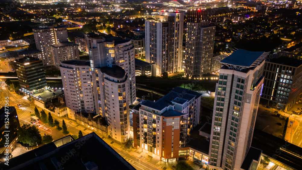 Aerial drone photo of Cardiff city centre at night, including residential apartments, student blocks and hotels alongside Bute Terrace