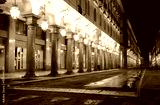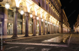 Night view of the road called VIA ROMA in Turin City in Northern Italy with many arcades and shop windows