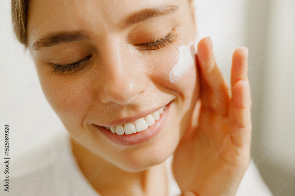 A woman enjoys applying nourishing cream, showcasing her skincare routine and celebrating her natural beauty