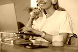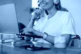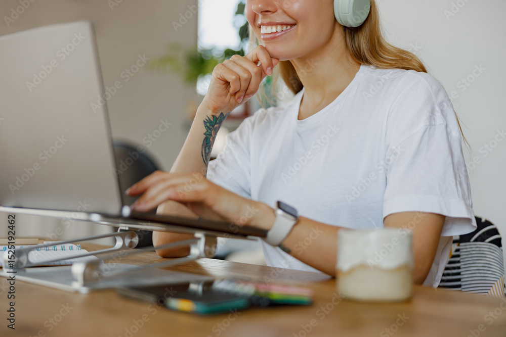 A young woman wearing headphones is diligently working on her laptop in a comfy and cozy home office space