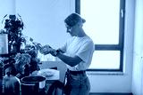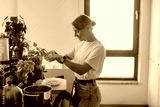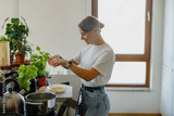 A woman joyfully prepares delicious food in a beautifully bright kitchen, surrounded by vibrant fresh herbs and plants