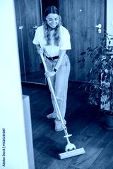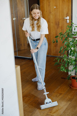 A cheerful woman enjoys cleaning her cozy, tidy home with an efficient vacuum in a contemporary style