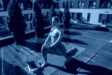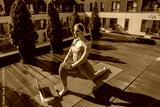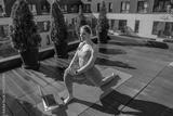 A woman diligently practicing yoga poses on a beautiful rooftop, surrounded by lush greenery and stunning urban views