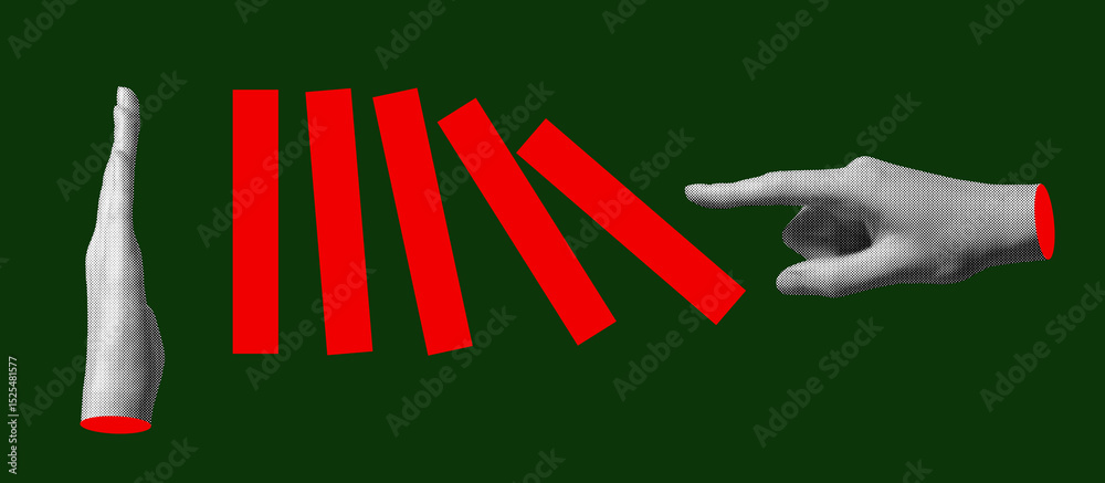 Hand gesture blocking falling dominoes. Abstract concept of intervention, defense, prevention,