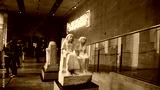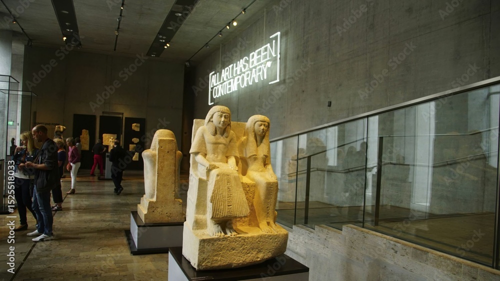 Museum visitors observing limestone statue depicting pharaoh amenemhat iii and spouse within modern art gallery interior