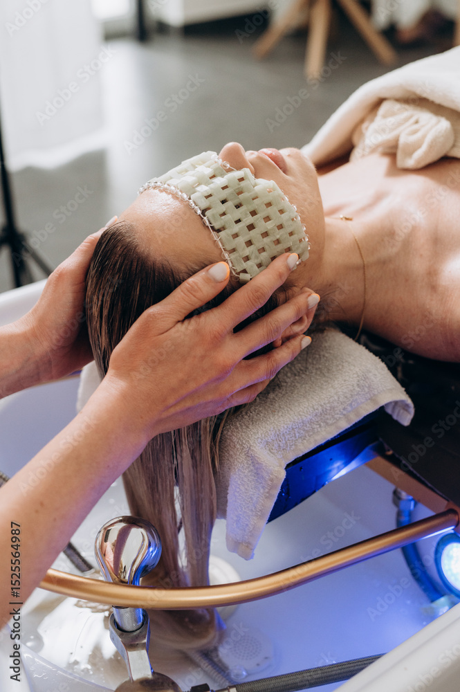 Close‑up of relaxed woman receiving spa massage on head and neck in tranquil salon setting