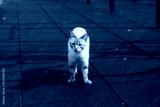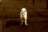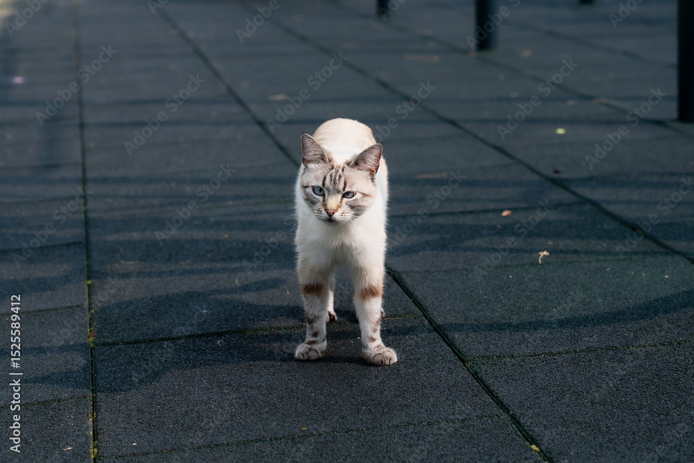 White dirty stray cat looking around for new home on dark background, homeless cat looking around for food