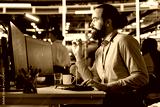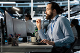 Programmer in data center using computer, doing software updates, verifying neural network parameters. Server room worker using PC to inspect configurations, ensuring optimal application performance