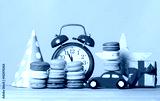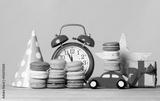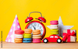 macaroons, toys, Birthday hat, alarm clock and gift