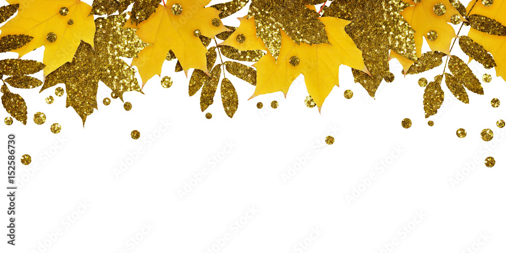 Yellow and golden autumn leaves and glitter drops