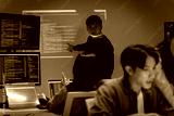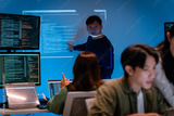 Asian software engineer or programmer team working late in development office,problem solving or algorithm of ai assistant helping for work.software developer,digital technology security concept