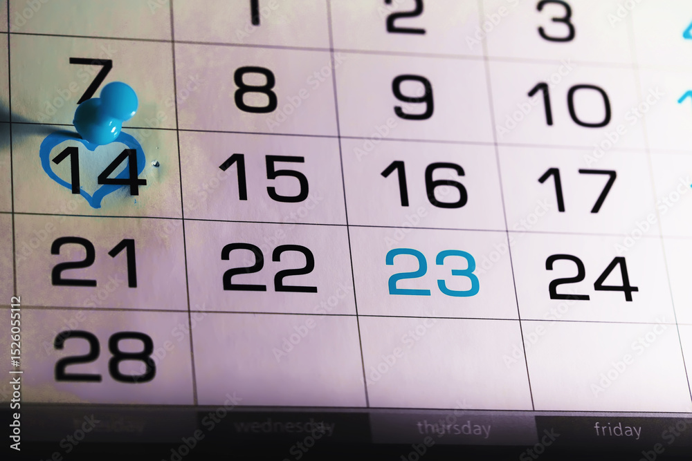 Calendar with circled date february 14. Blue heart shape. Blue flag. Valentines day.