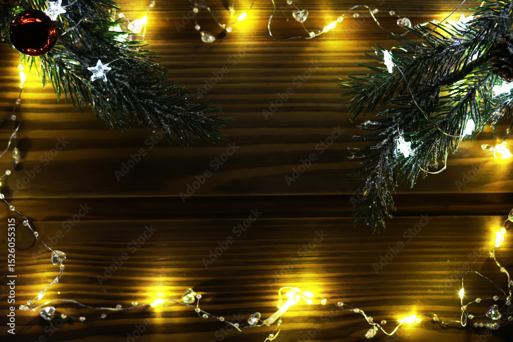Christmas fir tree with decoration on dark wooden board background. Border art design with Christmas tree