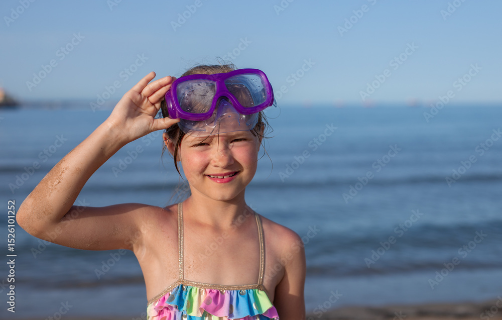 Toddler girl with purple snorkeling goggles at the beach on a sunny day