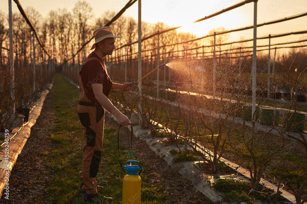 Farmer using pesticide, insecticide and herbicide sprayer sprinkler in an blueberries farm outdoors in springtime, before blooming.