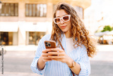 Stylish young woman wearing sunglasses and holding a phone in hands, enjoying walk in the old town. Walking, tourism, technology concept. Tourist blogging from phone while relaxing outdoors.