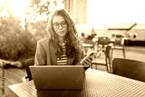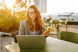 A business woman with curly hair and glasses at a table with a laptop and a phone in her hands. A beautiful female freelancer works outdoors and enjoys the sunset on a rooftop.