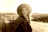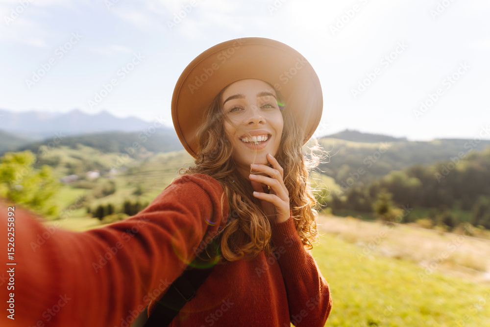 Portrait of a traveler in a hat taking a selfie on her phone. A joyful woman enjoys the mountain landscape and blogs. Travel, blogging concept.