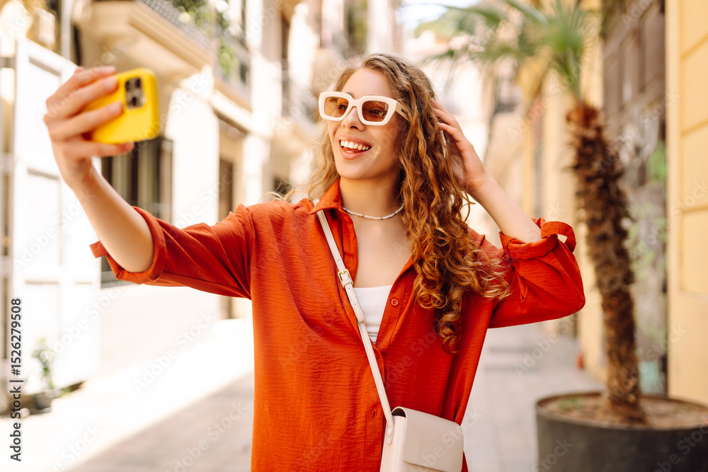 Portrait of happy woman in hat taking selfie on sunny city old streets background. Beautiful tourist blogs on phone, enjoys sunset walk. Tourism, blogging concept.