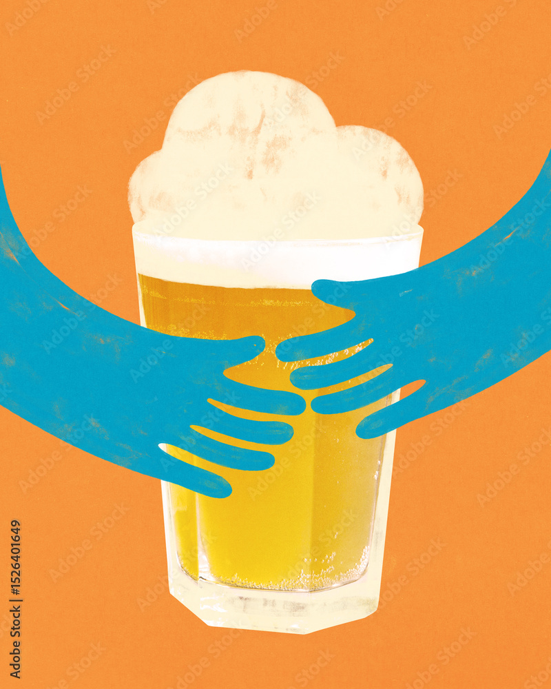 Blue cartoon hands gently hugging beer glass with foam on bright orange background. Modern art design. Flat folk design. Concept of cozy beer time, chill drink, bar fun, and weekend mood.