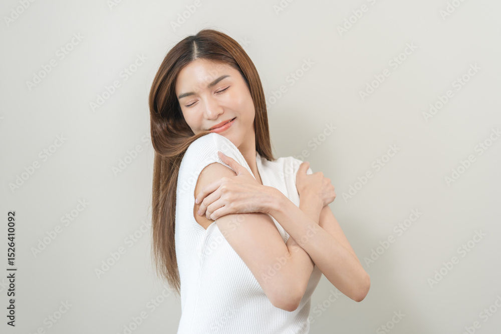 Smiling positive, hug self care happy asian young woman hands hugging herself shoulders, enjoy yourself, self love and self care, smile girl face expression self esteem standing isolated on background