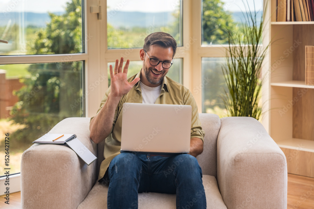 Young home-based online therapist in virtual counseling session, focused mental health professional listening to client on video call taking notes offering support and empathy in calm domestic setting