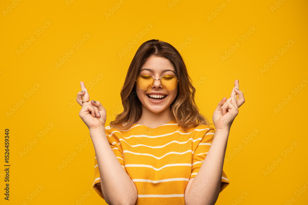 Bright portrait of a smiling woman wearing yellow in a matching cheerful background. Represents positive emotions, enthusiasm, and moments of wishful thinking, captured with a joyful expression and
