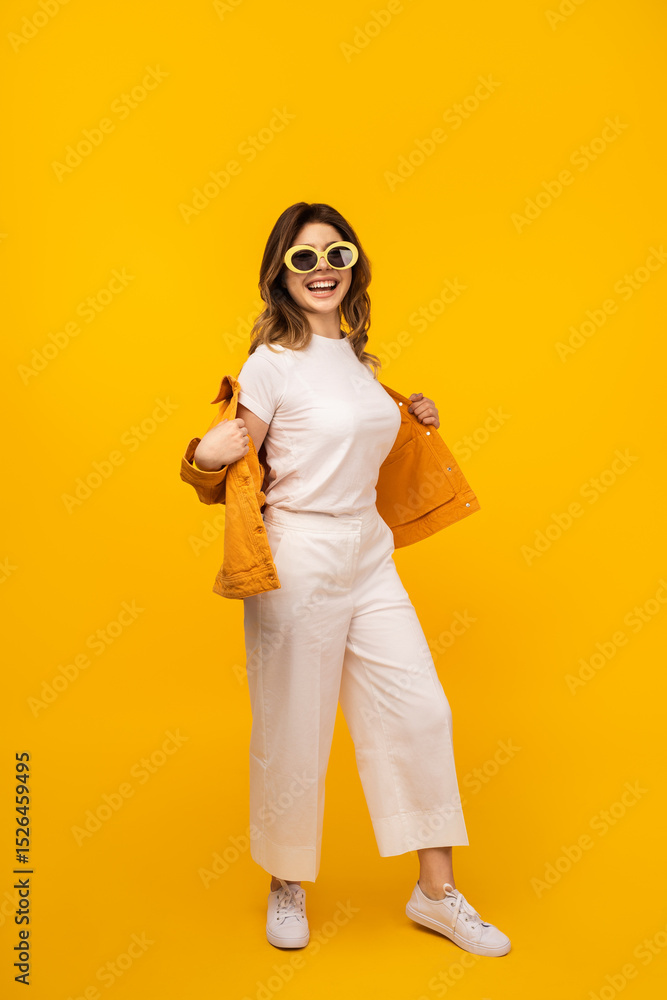 Vibrant image featuring a joyful woman wearing sunglasses and stylish clothes, portrayed on a bright yellow background, conveying happiness and energy.