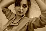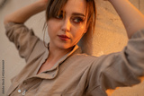 A beautiful close-up portrait capturing a woman in natural lighting, showcasing a serene and introspective expression. Features warm, golden-hour tones and a stylish, modern appearance.