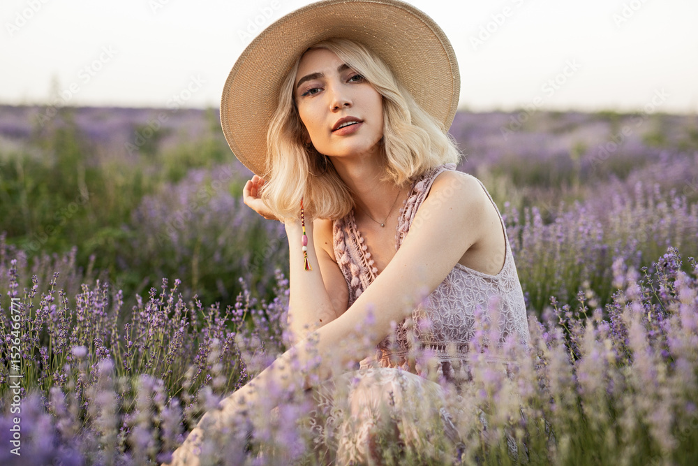 A serene scene of a blonde woman seated in a blooming lavender field, sensuously enjoying the natural scent, wearing summer attire and a sun hat, set during a soft golden hour.