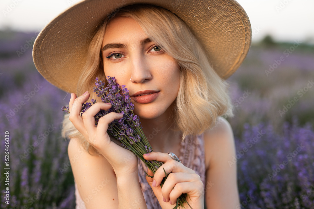 A beautiful blonde woman wearing a straw hat holding lavender flowers in a vibrant lavender field, evoking calmness and charm with natural beauty. The serene setting conveys harmony and tranquility.